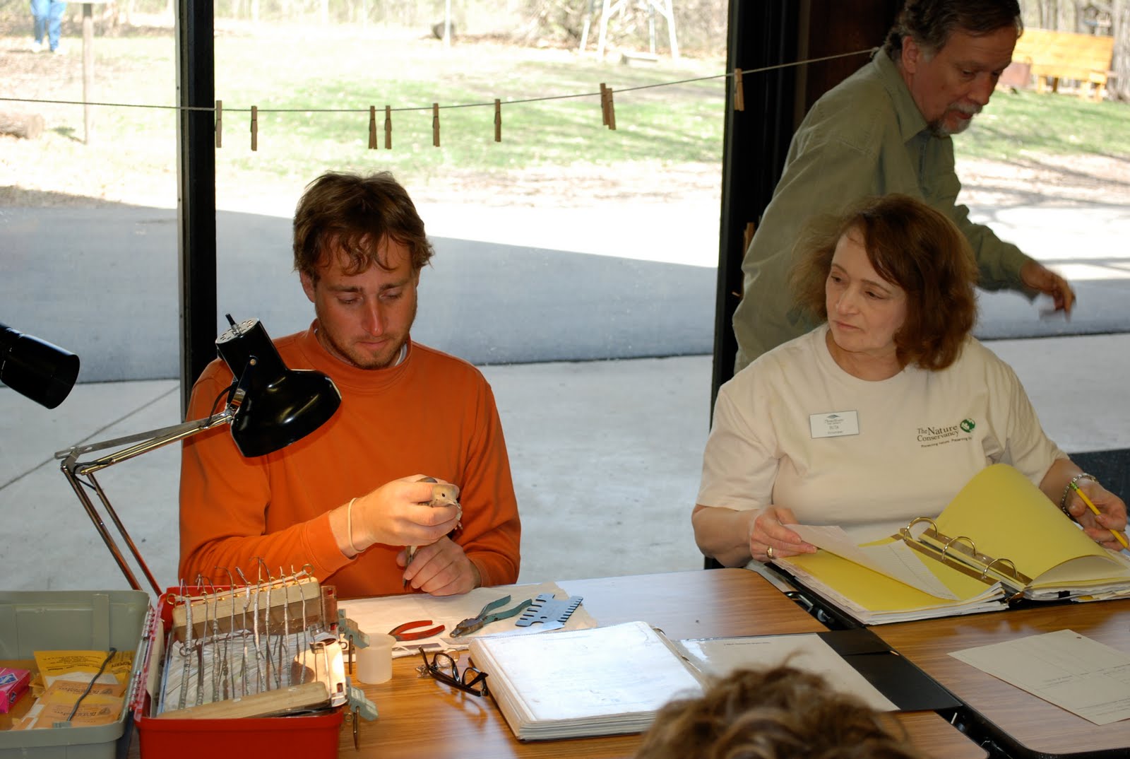 Some of our regular residents also showed up such as this Downy Woodpecker, Picoides pubescens. The one skill banders are always improving is their ability to get birds out of mist nets efficiently and without harming the bird. It doesn't help when the bird you're removing is trying to drill a hole in your fingers.